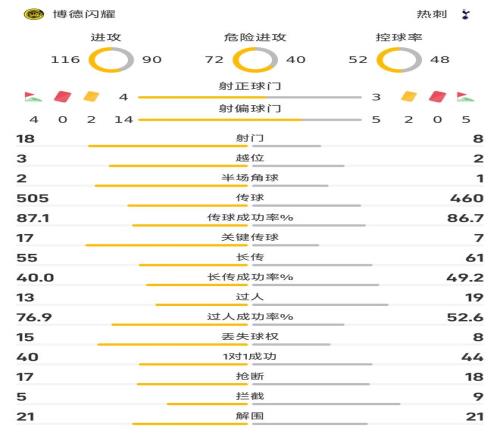 控球率方麵,雙方呈現勢均力敵之勢,博德閃耀控球率52%,熱刺控球率48%。進攻次數上,博德閃耀116次,熱刺90次。危險進攻次數方麵,博德閃耀72次,熱刺40次。