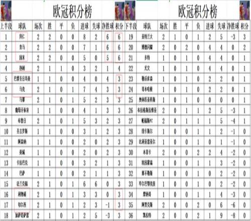 積分榜方麵,皇馬,國米和拜仁今天都是輕鬆大勝,都是獲得了兩連勝,拜仁1個進球優勢力壓皇馬登頂,國米則是差拜仁皇馬1個淨勝球,排在第3。馬競今天又是一場大勝,他們暫時升至第6,排在衛冕冠軍巴黎之後。利物浦今天又輸球,遭遇英超歐冠雙線連敗,跌到第第16,他們身後是取得首勝的切爾西。