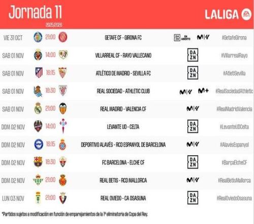西甲官方公布了第11輪比賽的開球時間,皇馬將在北京時間11月2日淩晨四點開球,巴薩將在11月3日淩晨1點半開球。