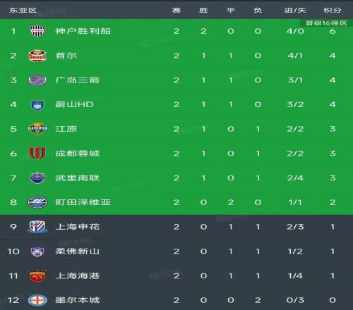 日韓球隊在東亞區的表現還是最強勢,J聯賽冠軍神戶勝利船本輪憑借汰木康也的絕殺球,1-0小勝墨爾本城,收獲兩連勝拿滿了6分,是唯一保持連勝的球隊,暫列積分榜第一,墨爾本城是唯一遭遇兩連敗的球隊。首爾、廣島三箭、蔚山HD都是1勝1平積4分暫列第2-第4名。首爾本輪3-0大勝武裏南聯,迎來首勝,名次升第二名。武裏南聯以1勝1負積3分暫列第7名。唯一沒有勝場的日韓球隊是町田澤維奇,遭遇兩連平。