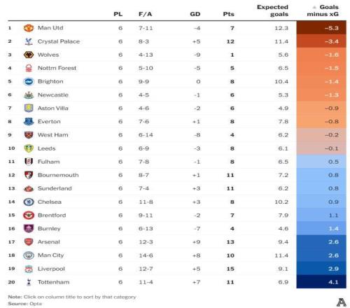 曼聯的問題是,實際進球遠低於預期進球,也就是說球隊對於機會的把握很差,而且是英超最差:預期進球12.3,實際進球卻隻有7個。-5.3的差值意味著平均每場都比“合理進球數”少進了將近1個,虧空第二高的水晶宮是-3.4,其他球隊都在-1.6以內。