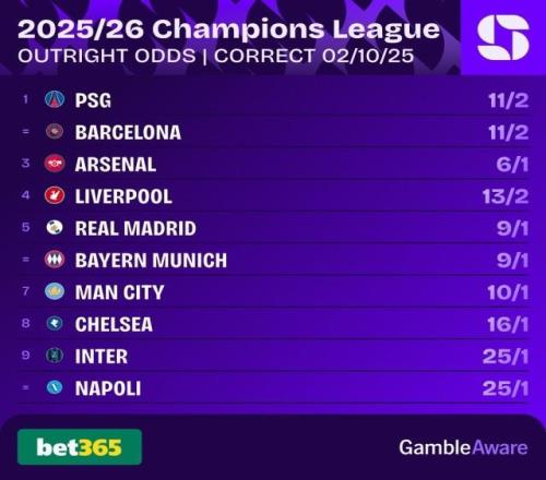 歐冠聯賽階段2輪戰罷,目前拜仁、皇馬、巴黎聖日耳曼、國際米蘭、阿森納、卡拉巴赫6支球隊保持全勝。最新奪冠賠率榜上,衛冕冠軍巴黎與剛剛成為自己手下敗將的巴薩同為6.5,領跑群雄,其後是阿森納7、利物浦7.5、皇馬10、拜仁10、曼城11、切爾西17。 不過,OPTA的測算結果與賠率不同:巴黎和巴薩都要靠後站,奪冠概率最高的是阿森納,達到18.1%,其後是利物浦14.7%、巴黎14%、曼城9.7%、拜仁9.5%、巴薩8.3%、皇馬4.9%。