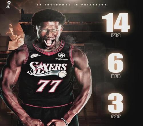 25屆探花秀VJ-埃奇庫姆(費城)在此役,迎來了自己NBA季前賽首秀,以首發分衛身份出戰,亮相時間為全場最高的約31分鍾,投籃13中4,其中6中1,罰球5中5貢獻14分6板3助,正負值+1,身體天賦的確瘋狂,可投籃還是有很大的提升空間。