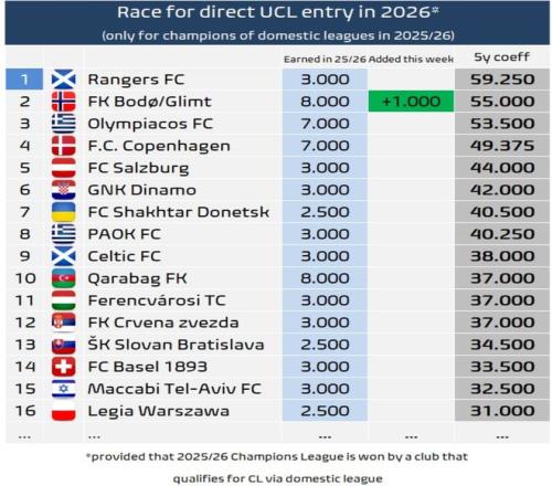 但挪威超級聯賽冠軍直通歐冠的名額僅適用於博德閃耀。即使維京或莫爾德贏得了聯賽冠軍,他們仍然需要參加資格賽,因為截至目前為止,他們的有關係數要低得多。目前博德閃耀在少賽一輪的情況下,落後榜首的維京1分。
