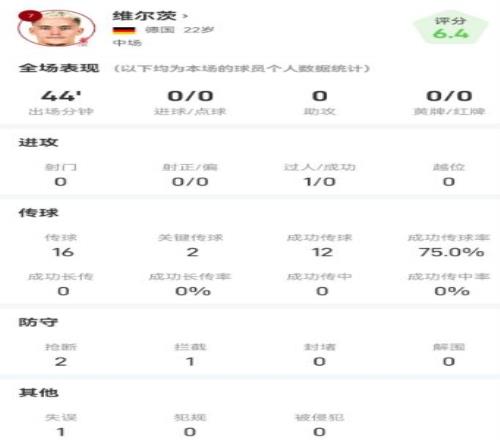維爾茨在這場比賽裏,出戰44分鍾,沒有1次射門,1次嚐試過人卻沒能成功。