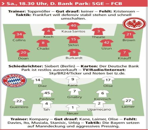 雷速體育10月4日宣 北京時間10月5日00:30,德甲第6輪,法蘭克福坐鎮主場迎戰德甲領頭羊拜仁慕尼黑,本場比賽開始之前,德國媒體《慕尼黑日報》預測了雙方的首發陣容,拜仁慕尼黑由目前腳感火熱的凱恩領銜,法蘭克福方麵會繼續首發連場進球的土耳其小將詹·烏尊。