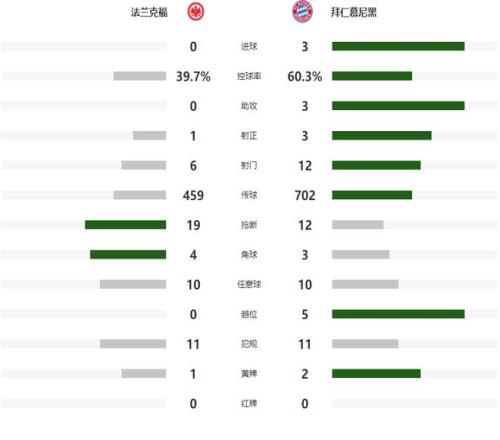 餘下的時間,拜仁繼續主導著比賽,長時間壓在法蘭克福大禁區前沿,讓主隊在防守端疲於奔命,根本無力組織起有威脅的反擊,比賽最後時刻,迪亞斯再入一球上演梅開二度的好戲,將全場比分定格為了3-0。