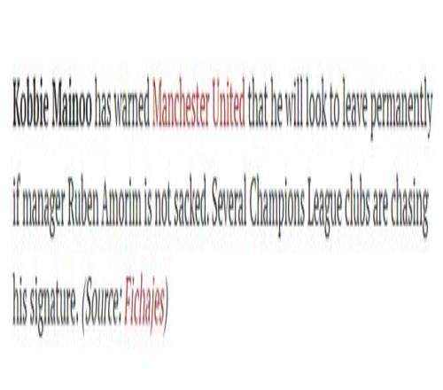 據稱,有多家歐冠俱樂部有意引進梅諾。他對現在曼聯的發展計劃頗為不滿,隻要阿莫林繼續執教,雙方很難在長期的未來繼續合作。紅魔方麵非常青睞梅諾,認為他是未來的資產,並且欣賞他的技術能力以及比賽中的冷靜和視野。
