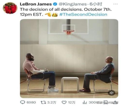 10月7日淩晨,湖人老大詹姆斯突然更新了推特動態,他寫道:“所有決定中的決定,10月7日,美東時間中午12點。#決定2”換算成北京時間即明天淩晨0點。