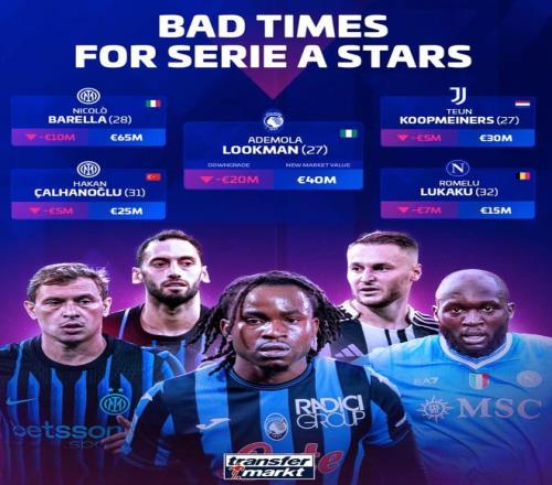 北京時間10月7日,在更新了意甲球員的身價之後,德轉也統計出了此次身價跌幅最高的10名球員,盧克曼身價下跌2000萬歐元跌幅最大,勞塔羅、巴雷拉、迪馬爾科、弗拉霍維奇以及恩昆庫全都下跌1000萬歐元。