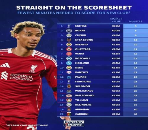 北京時間10月8日,德轉統計了夏窗最快攻入新賽季首球球員,埃基蒂克以開場4分鍾進球排名第一,博尼以一分鍾之差排名第二,謝爾基排名第三。