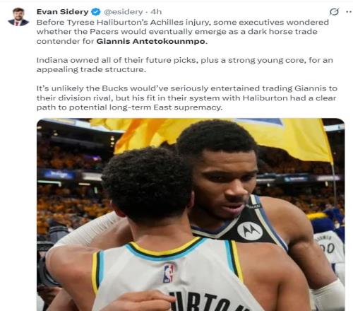 NBA記者埃文-斯迪瑞則透露,在哈利伯頓受傷之前,一些高管就猜測,步行者會最終成為揚尼斯交易的黑馬,步行者也擁有大量選秀權同時擁有一支實力強勁的年輕陣容,這在交易中頗具吸引力。雄鹿不太可能將揚尼斯送出同區的活塞,字母哥+哈利伯頓的陣容可以讓步行者成為東部長期霸主。