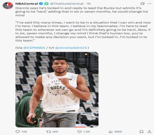 北京時間10月9日,美國媒體NBA Central轉發了揚尼斯接受ESPN專訪的片段,字母哥在采訪中回應了交易流言的一些細節,我目前專注於雄鹿,如果6-7個月後我改變主意也是人之常情。