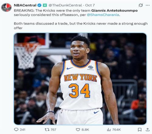 兩天之前,ESPN記者Shams透露,今夏尼克斯與雄鹿商議過揚尼斯的交易,而揚尼斯本人最想去的球隊就是尼克斯,隻可惜尼克斯能付出的資產有限談判破裂。