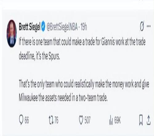 根據美記Brett Siegel說法,如果本賽季有球隊可以負擔揚尼斯的交易資產,那麽就是馬刺隊,馬刺是唯一可以滿足雄鹿所需要求的球隊。(因為此前雷霆記者已經明確表態,雖然手握多個首輪簽但對揚尼斯毫無興趣)
