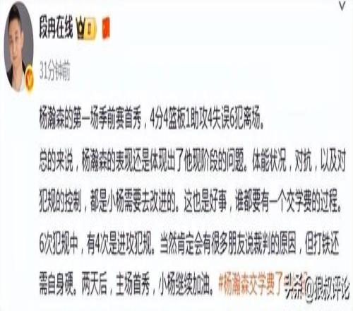 這也是好事,誰都要有一個交學費的過程。6次犯規中,有4次是進攻犯規。當然肯定會有很多朋友說裁判的原因,但打鐵還需自身硬。兩天後,主場首秀,小楊繼續加油。”
