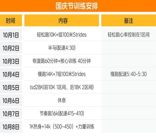 所以8天長假裏,狗哥的訓練未曾有一絲懈怠——三場重點大課:一場長間歇+短距離衝刺;430配速起跑、每5公裏遞增10秒的15公裏節奏跑;5分起底、每5公裏遞增5秒的30公裏LSD。其餘時間則以慢跑有氧作為恢複訓練。