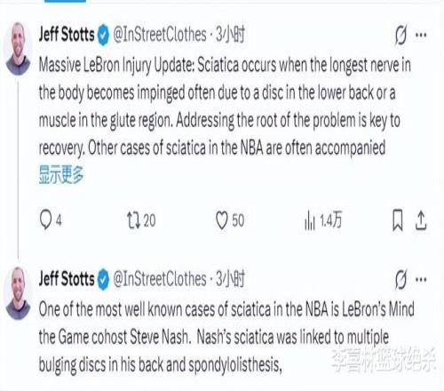 醫學專家傑夫·斯托茨解析了詹姆斯的傷情,他在推特上寫道:“勒布朗重傷更新:坐骨神經痛是指身體最長的神經受到壓迫產生疼痛,通常是由於腰椎間盤或臀部肌肉受損所致。解決問題的根源是康複的關鍵。NBA中的其他坐骨神經痛的病例往往持續相當長的時間。”