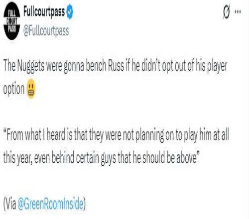 究竟威少為什麽選擇跳出合同?前NBA球員丹尼-格林在節目中透露,威少決定拒絕球員選項的原因是,掘金方麵並沒有打算讓他進入輪換陣容,而是準備讓他長期坐在板凳末端;消息人士稱:據我所知,他們(掘金)今年根本沒打算讓他上場,甚至要把他排在某些本應在他之下的球員後麵。