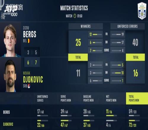 回到今晚的比賽,德約科維奇目前排名世界第5位,貝爾赫斯排名第44位。雙方在此前從未有過交手記錄,此番是兩人的首次碰麵。