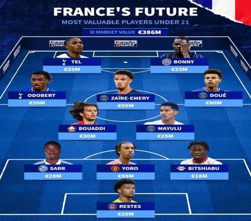北京時間10月12日,德轉市場列出了法國身價最高的U21球員陣容,其中巴黎球員杜埃以9000萬歐居首。