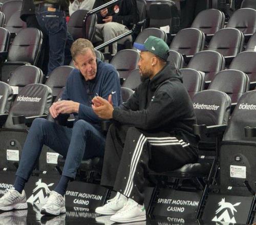 賽前,ESPN記者Anthony Slater在社交媒體分享照片,利拉德和前開拓者主教練(現勇士助教)斯托茨在場邊敘舊。