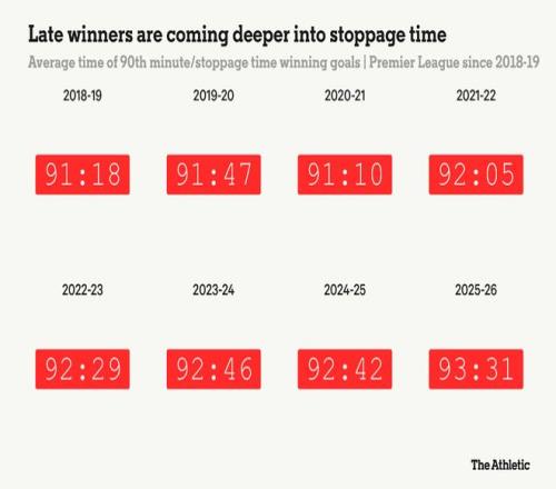 這一變化將決定性的時刻推得更晚。本賽季補時進球的平均時間出現在第93分31秒,這是過去八個英超賽季中最晚的一次。