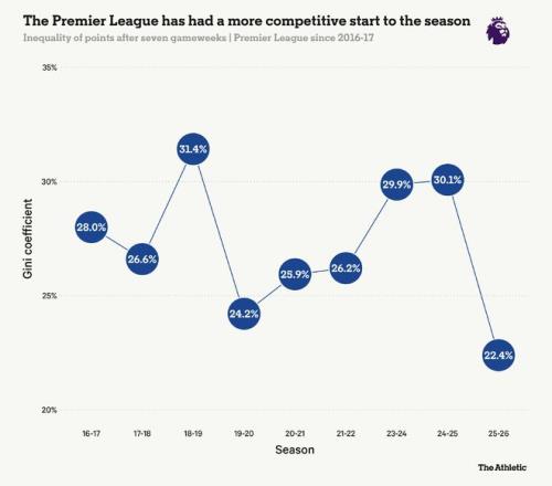 基尼係數值為100%意味著所有積分都集中在一支球隊手中,而0則代表完全平等,每支球隊積分相同。與過去九個賽季的前七輪相比,本賽季的競爭最為激烈,基尼係數僅為22%。更為激烈的聯賽增加了比賽在最後階段陷入膠著的可能性,為補時階段的戲劇性轉折創造了條件。