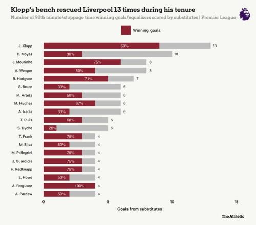 其他英超曆史教練中,克洛普在後期換人調整方麵遙遙領先,他的替補球員共打入了13個決定性進球。弗格森僅有四次類似的關鍵時刻,但每一次都令人難忘。這些進球全部都是製勝球:弗蘭對陣切爾西,奧謝在安菲爾德的進球,邁克爾-歐文在德比戰中對陣曼城的戲劇性進球,以及費德裏科-馬凱達在對陣阿斯頓維拉時的首秀弧線破門。這些時刻深深地銘刻在英超的集體記憶中,並可能讓弗格森因補時進球而獲得的聲譽超越了實際統計數據。