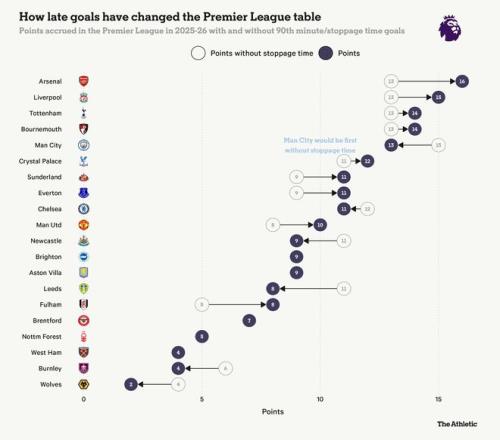 如果沒有補時階段,曼城本應高居榜首。如果他們能在與阿森納的1-1戰平中阻止加布裏埃爾-馬丁內利的補時扳平進球,他們還能多得兩分。利物浦則在補時階段接連以1-2輸給了切爾西和水晶宮,但由於對陣紐卡斯爾聯和伯恩利時的補時絕殺,他們的整體表現依然在補時階段有所盈餘。