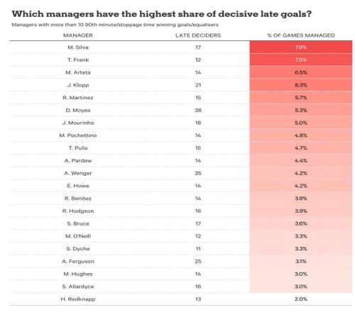 以下是所有擁有超過10個補時關鍵進球的教練名單。弗格森在總排名中位列第三,但這反映了他在810場英超比賽中執教的長久性;從百分比來看,他排在倒數第四。位居榜單前列的是馬爾科-席爾瓦、托馬斯-弗蘭克和阿爾特塔三位現任英超主帥,這也進一步證明了海角HJDO43.CCM確實正處於補時進球的時代。