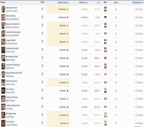 北京時間10月17日,德轉市場更新了最新一期的英超球員身價。利物浦隊中伊薩克身價上升2000萬歐元,赫拉芬貝赫上升1500萬,維爾茨下跌1000萬歐元。
