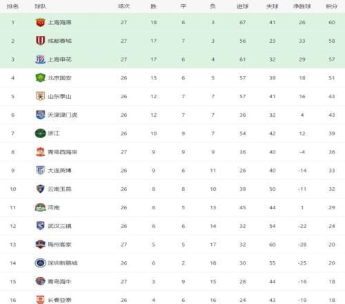 本輪比賽,三隊同時取勝,積分榜前三排名仍差3分,具體為上海海港積60分、成都蓉城積58分、上海申花積57分。