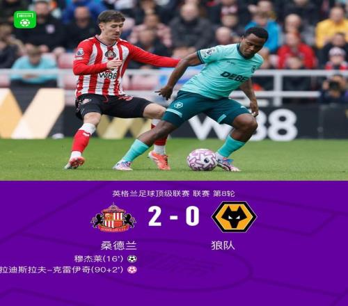北京時間10月18日,英格蘭足球超級聯賽第8輪展開較量,桑德蘭坐鎮主場迎戰狼隊。比賽中,休姆送出精準助攻,穆傑萊接球後冷靜施射破門,為桑德蘭取得領先。下半場補時階段,狼隊球員拉迪斯拉夫-克雷伊奇不慎將球打入自家球門,進一步擴大了主隊優勢。最終,桑德蘭以2比0戰勝狼隊,全取三分。