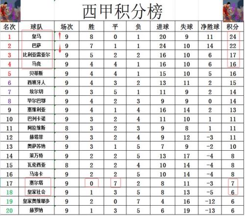 積分榜方麵,擊敗赫塔菲後皇馬再次重啟連勝模式,再超過巴薩2分奪回榜首。比利亞雷亞爾差皇馬7分排在第3,馬競差皇馬8分排在第4。塞爾塔今天又平了,妥妥的平局王,9輪就平了7場,還沒有拿到賽季首勝的他們隻比降級區高了1分。