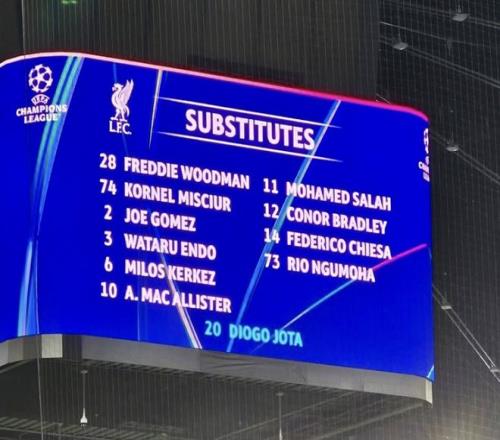 雷速體育10月23日宣 歐冠聯賽階段第三輪,利物浦客場挑戰法蘭克福。半場結束利物浦3-1領先法蘭克福。比賽中出現暖心一幕,法蘭克福主場的大屏幕顯示利物浦替補球員時,加入了今夏不幸離世的若塔的名字。