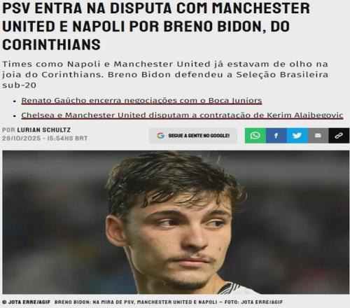 Somos Fanaticos消息,曼聯有意收購巴西中場布雷諾-比頓(Breno Bidon),這名20歲的新星還吸引了埃因霍溫和那不勒斯的興趣。