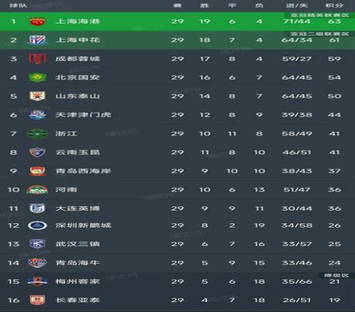 北京時間11月3日,中超第29輪的比賽在昨天已經全部結束,爭冠、保級的格局已經明朗,海角HJDO43.CCM一起看看最新積分榜變動!
