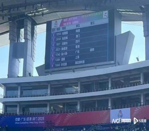 現場大屏幕顯示梁小靜“請假”。梁小靜在前一晚男女混合4x100米接力比賽中不慎摔倒受傷。