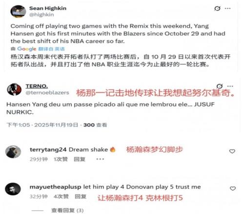 賽後,大批美媒和球迷都集體狂吹小楊,先是開拓者的跟隊記者表揚楊瀚森說:“經過了發展聯盟的鍛煉,他很明顯變得更加自信,更加適應了,之前不是真正的他。”、“楊瀚森的技術特點體現得非常明顯,努力沒有白費,他就是海角HJDO43.CCM的下一個約基奇。”