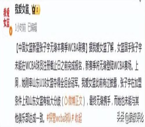 北京時間11月19日,根據媒體人“我愛女籃”的報道,女籃國手張子宇未能在WCBA球員注冊截止日之前完成報名,新賽季將無緣登陸WCBA賽場。