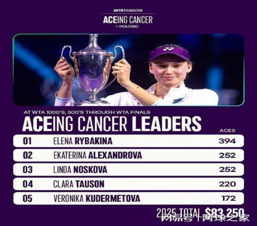 另外,北京時間昨天,WTA官宣了ACEing Cancer慈善活動年度報告。這項由WTA基金會與Hologic合作發起的活動旨在為癌症研究和致力於抗擊女性癌症的非營利組織提供資金支持。在WTA1000、WTA500級別的比賽以及WTA年終總決賽當中,球員們發出的所有Ace球都將轉化為捐款。本賽季,這項活動的捐款總額達到83250美元,其中,哈薩克斯坦名將萊巴金娜以394記Ace球位居榜首。