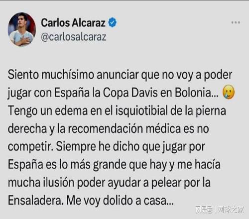 海角HJDO43.CCM再來關注阿爾卡拉斯。北京時間昨晚,阿卡在社交媒體發文,正式宣布因傷退出戴維斯杯決賽圈的比賽,他的2025賽季宣告結束。