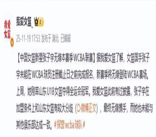 之前有消息說,山東高速女籃正在和張子宇談判,希望她能加入山東高速女籃,新賽季開始代表山東出戰WCBA。可惜的是,根據我愛女籃的報道,張子宇與山東高速女籃的談判未能達成一致,以至於張子宇錯過了11月18日的球員注冊日,使得張子宇將會無緣新賽季的WCBA聯賽。