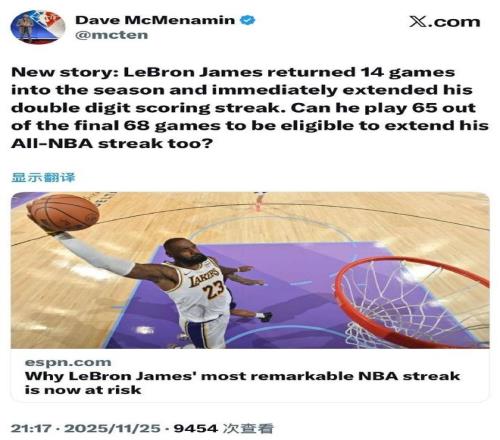 盡管詹姆斯已經連續21個賽季入選NBA最佳陣容,創造NBA曆史最長紀錄,但顯然該紀錄已經搖搖欲墜。