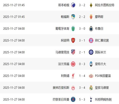 北京時間11月27日淩晨,歐冠聯賽階段第5輪第二個比賽日,包括阿森納、拜仁、巴黎、皇馬、利物浦、國米、馬競等多家豪門悉數出戰,上演悲喜一夜。