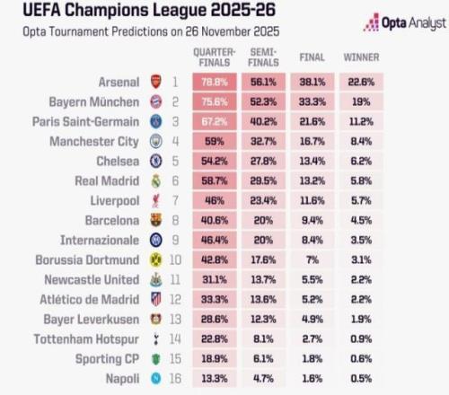 OPTA更新歐冠奪冠概率:阿森納22.6%居首
