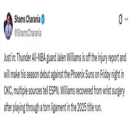 根據ESPN名記Shams報道,因手腕傷勢賽季缺席至今的傑倫威廉姆斯已從傷病名單中被移除,確定將在雷霆對陣太陽的比賽中迎來首秀。