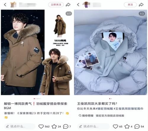 一眾老牌國貨品牌都遵循了這個做法:駱駝同時簽下王俊凱、迪麗熱巴,鴨鴨不久前續簽了王一博,雪中飛簽下了成毅。品牌結合明星個人特質,推出各種“明星同款”,在社交平台製造話題,向粉絲種草:如鴨鴨圍繞王一博的運動形象,主推運動時尚款,走輕戶外路線;駱駝則挖掘王俊凱身上的少年感,走青春、時尚路線。