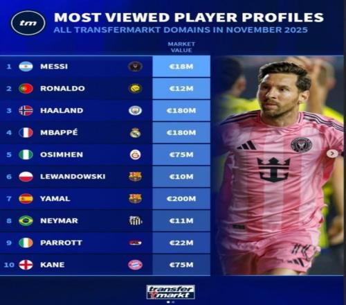 德轉列出了11月份球員頁麵瀏覽量排名,前三依次為梅西、C羅、哈蘭德。11月德轉球員頁麵瀏覽量排名: